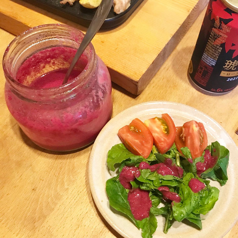 畑のルッコラにビーツのピクルスで作ったドレッシングのサラダ。