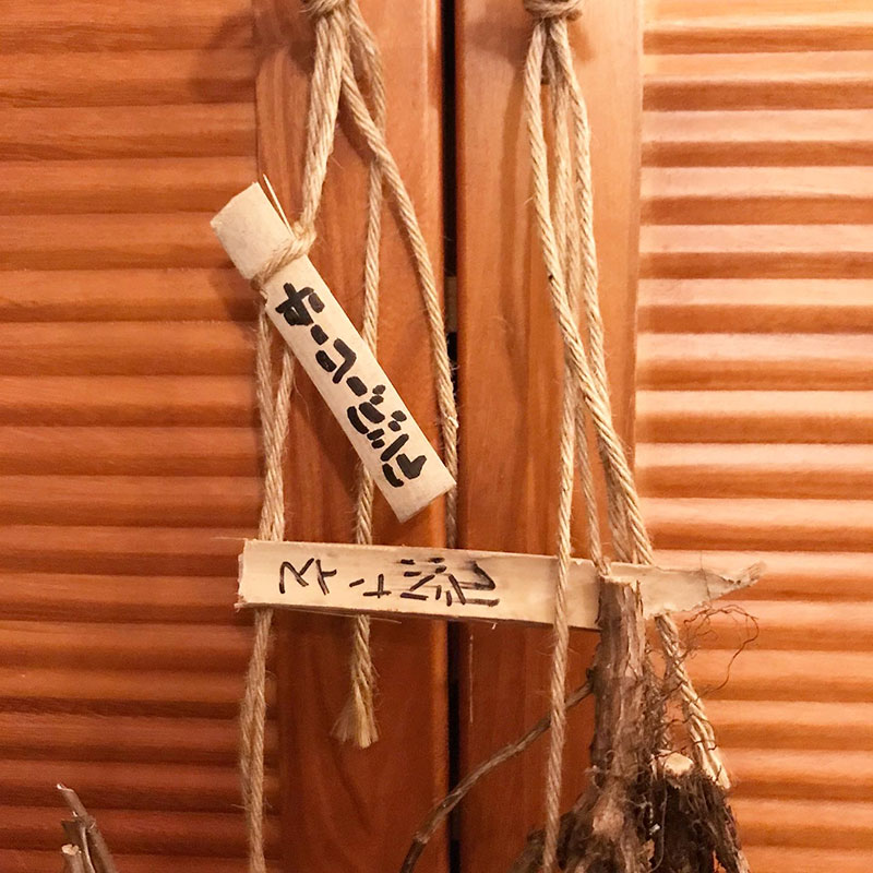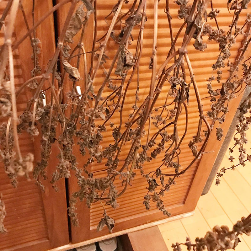 自家採種のために玄関の軒先に吊るして乾かしてる4種類のバジル。