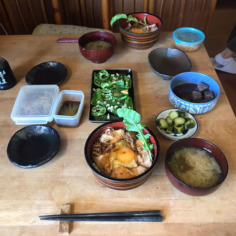 昼飯は昨日の鶏肉の土鍋煮で変形親子丼。畑のルッコラ添えて。