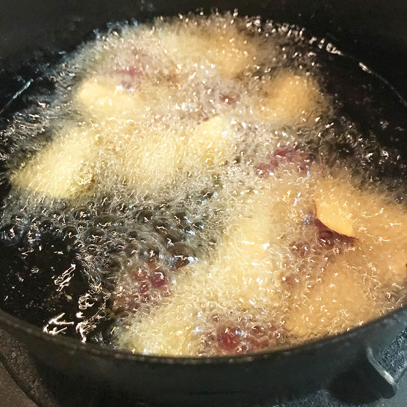 沖縄の黒糖と醤油と水をフライパンでとろみが出るまで煮たところに