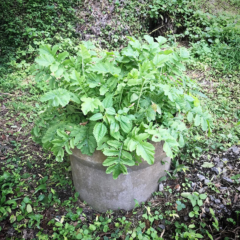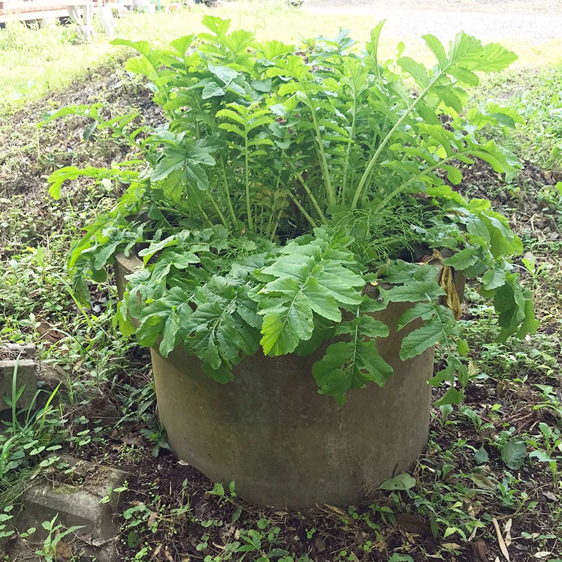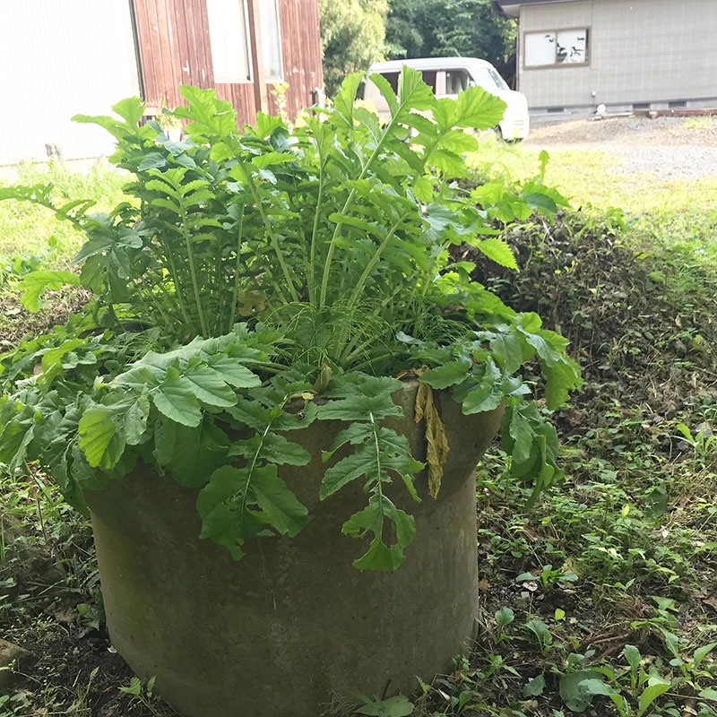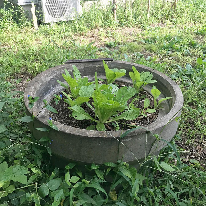 庭にあったコンクリートの土管に土をふるい入れて土管大根と土管白菜を育てる実験中(笑)