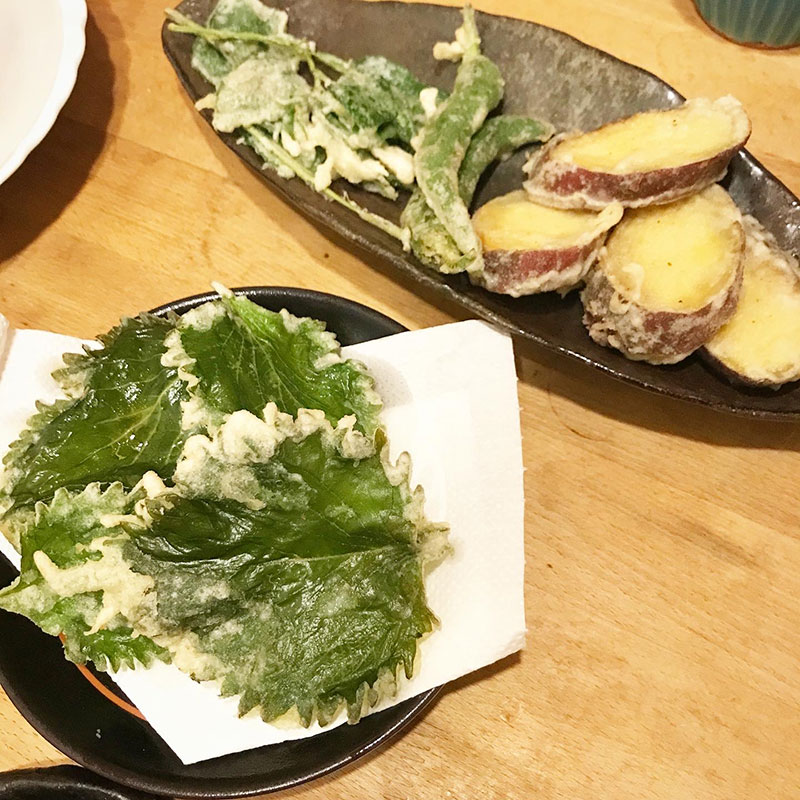 なると金時と畑の大葉、モロヘイヤ、万願寺とうがらしをカミさんが天ぷらにしてくれた。
