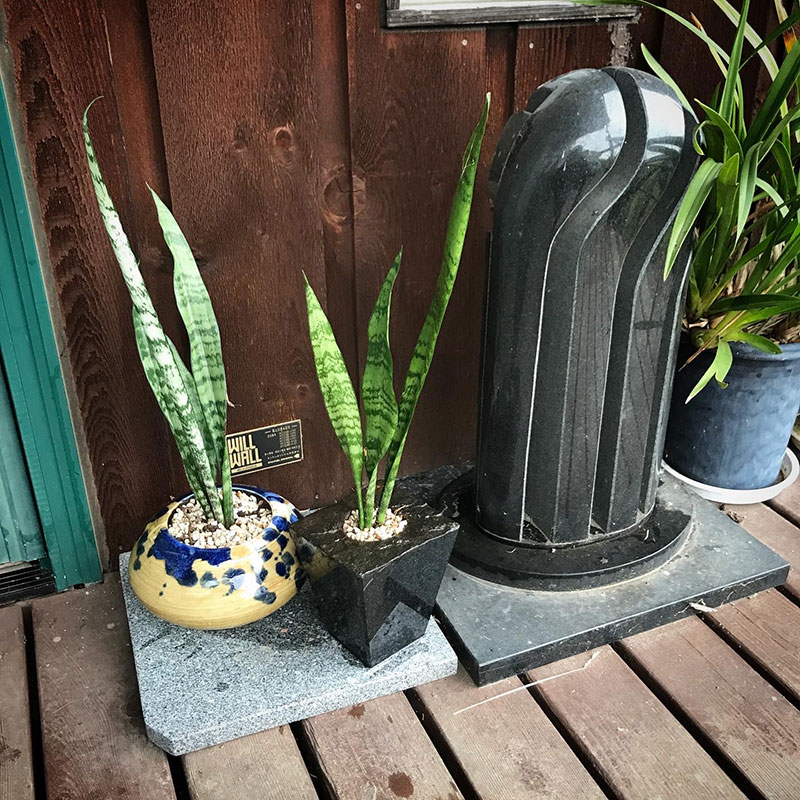 大学の時に作った焼き物で育ててるサンスペリア(トラノオ)が大きくなって鉢がぎゅうぎゅうになったので石の花器とにふたつに分けた。