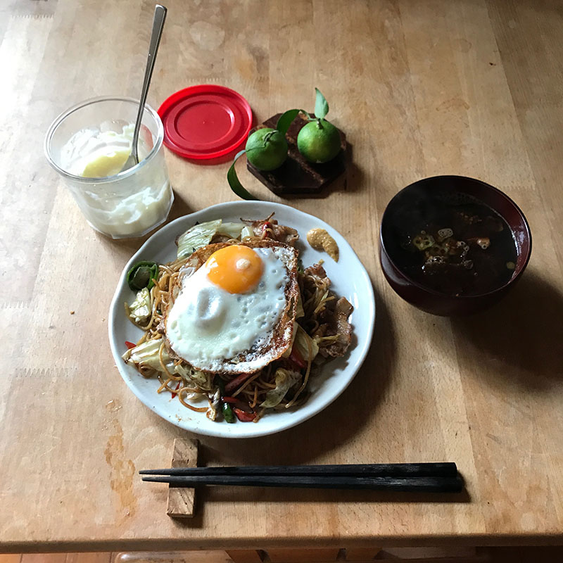 昨日に続いて焼きそばの昼飯。麺をしっかり焼くのが好み。”焼き”そばだからね。焼きそばにも味噌汁にもすだちをたっぷり搾って。味噌汁には畑のオクラを採って生のままスライサーで薄くスライスして投入。ねばねばが美味しいねー。
