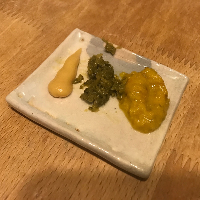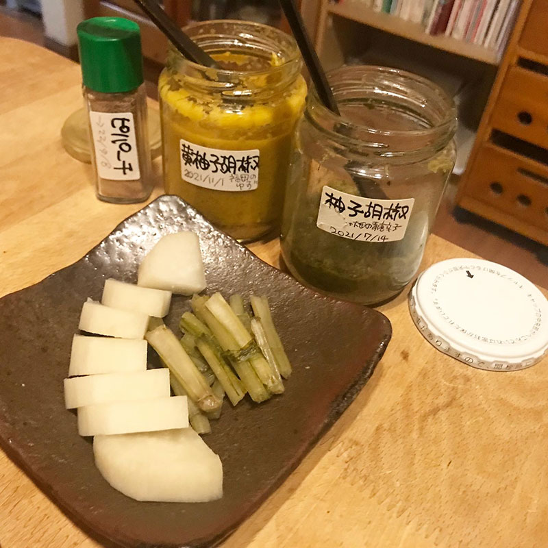 からしだけじゃ無くて自家製の柚子胡椒と黄色の柚子で作った黄柚子胡椒もアクセントに使う。