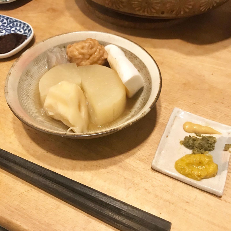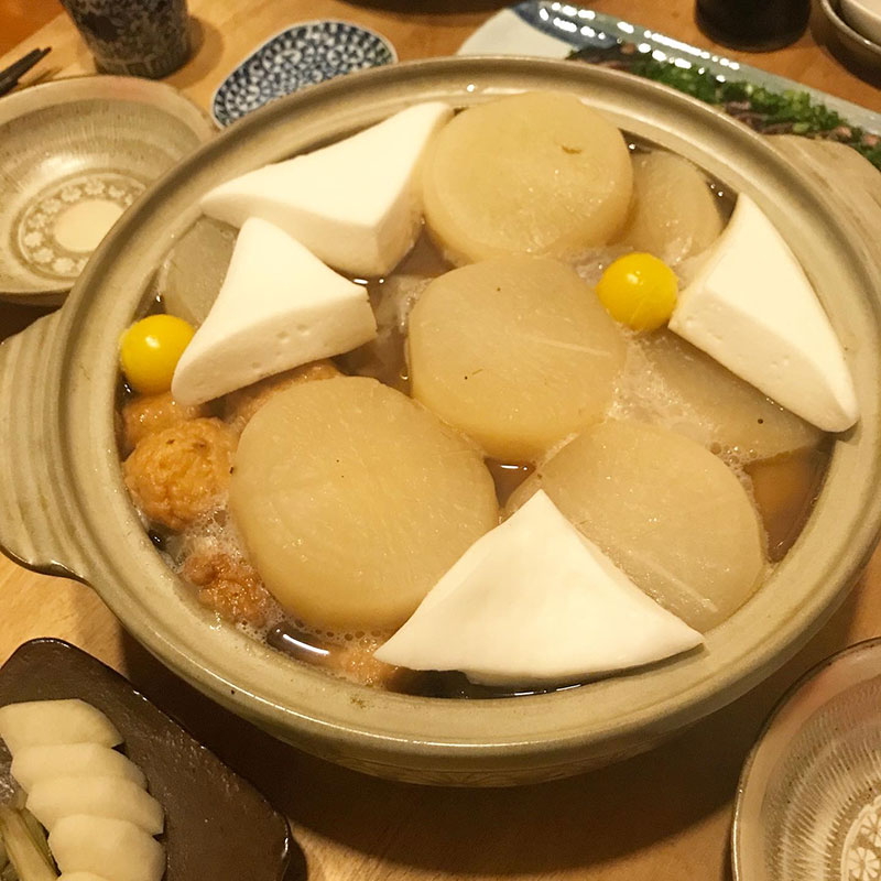 居酒屋我家、開店。土鍋おでん。昨日、いただいたたくさんの大根が素晴らしくて大きな一本で我が家の一番大きな土鍋満タンになってしまった。昨日、下茹でして最初に大根だけ煮ておいたけど今日カミさんが買ってきてくれた他のおでん種入れるスペース無くて、