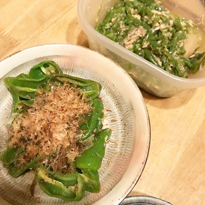 畑のピーマン、今年最後の収穫。焼いて梅醤油で味付け。漬けてる梅も刻んで。梅醤油作って良かった。庭の梅の木の実をただ醤油に漬けるだけで簡単なのに使いでがある。それと無限ピーマン。