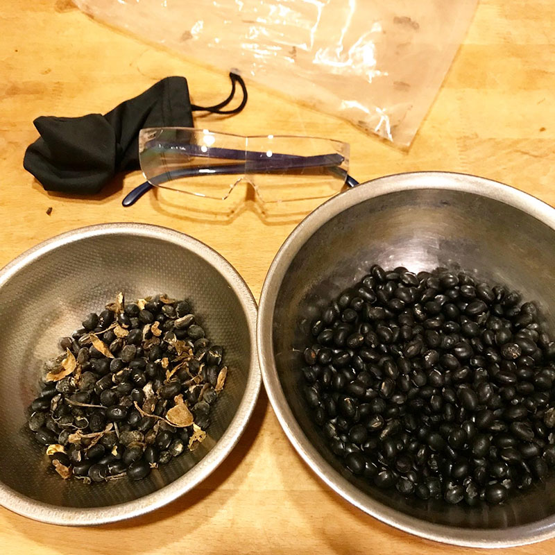 黒豆をいただいた。刈り取りっぱなしだからクズ豆や枯れた枝葉、土の塊を除いていく。
