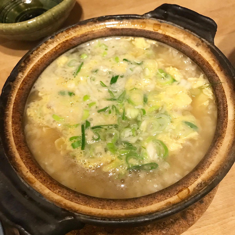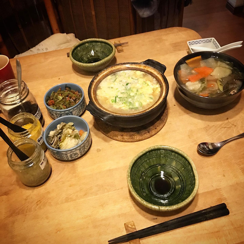 昨晩の鶏の水炊き鍋の残りでおじやの夕食。