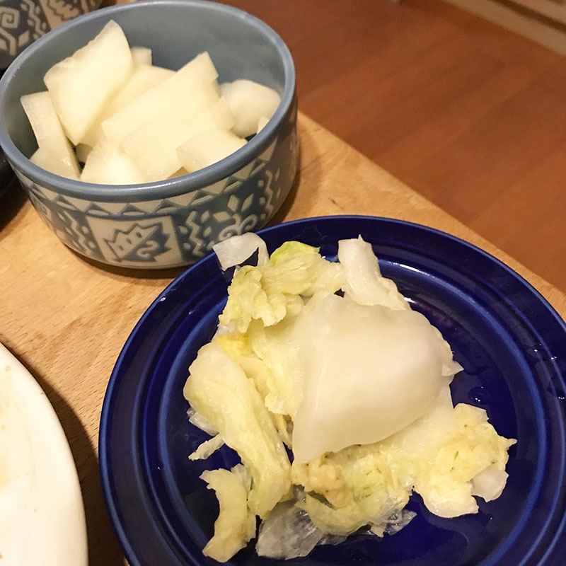 大根の生漬けと白菜漬け。なんか白菜漬け美味しくないなぁと思っていたけど2日前に仕込んだ白菜漬けが甘くて美味しい。野菜は寒さにあたると一気に甘みが増す。これまでの白菜は異常な暖かさの中で育ってたからあまり美味しくなかったんだな。今回のは外側の凍てた(凍ってた)葉をめくって漬けたけど甘い!旨い!大きな白菜3つ漬けたからたくさん食べられるぞ。