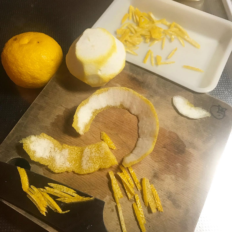 柚子皮剥いて千切りに。