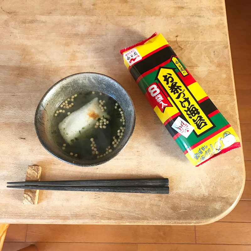ご馳走食べ続けのお正月の箸休め的なお楽しみ、焼き目をつけた杵つき餅と永谷園のお茶づけ海苔の雑煮。