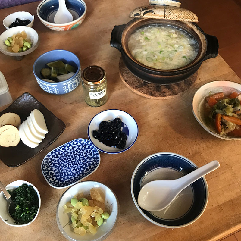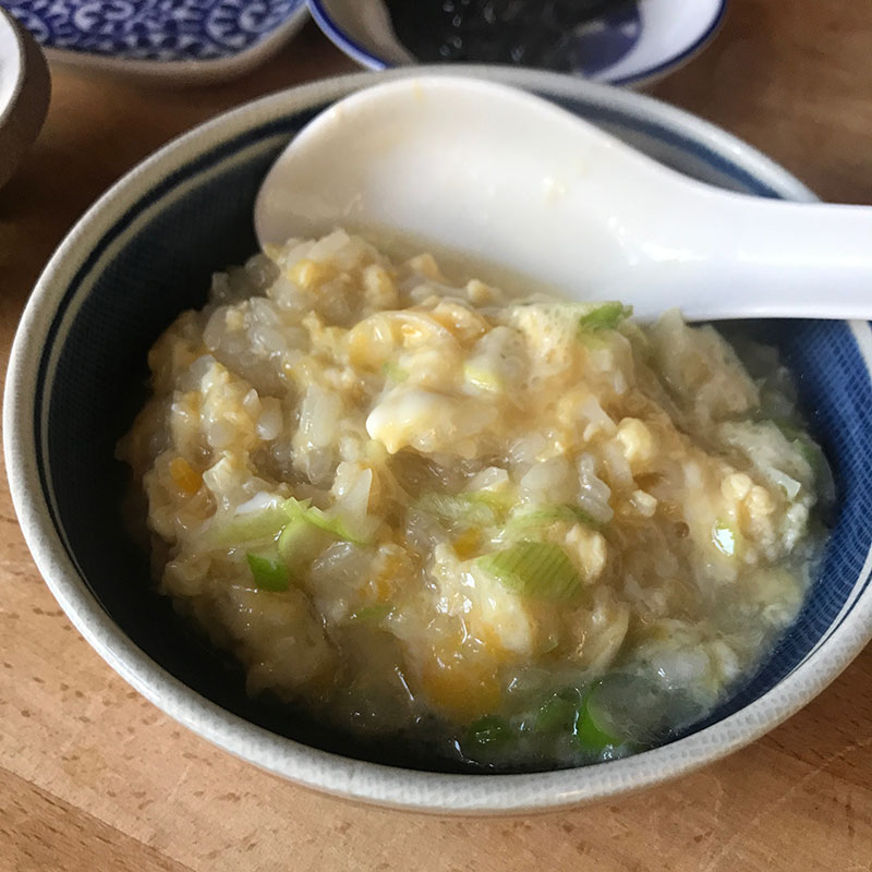 昨晩の合鴨の鍋の残りでおじやの昼飯。
