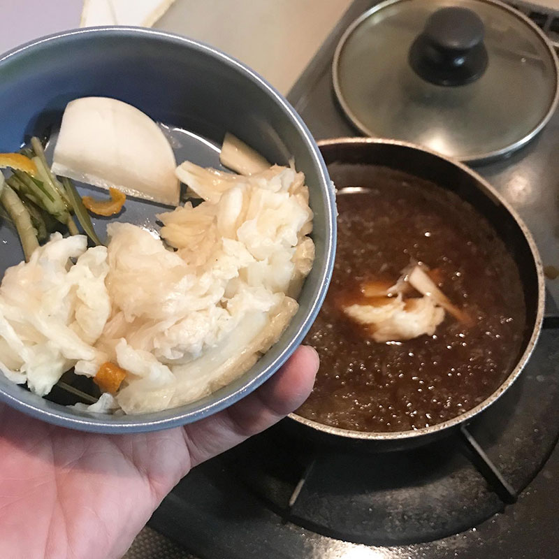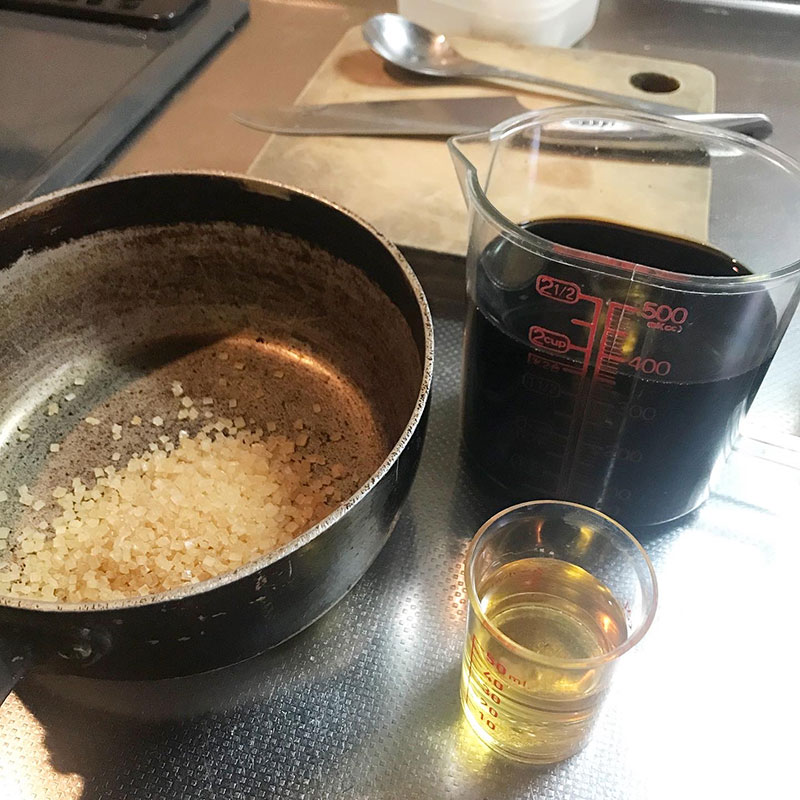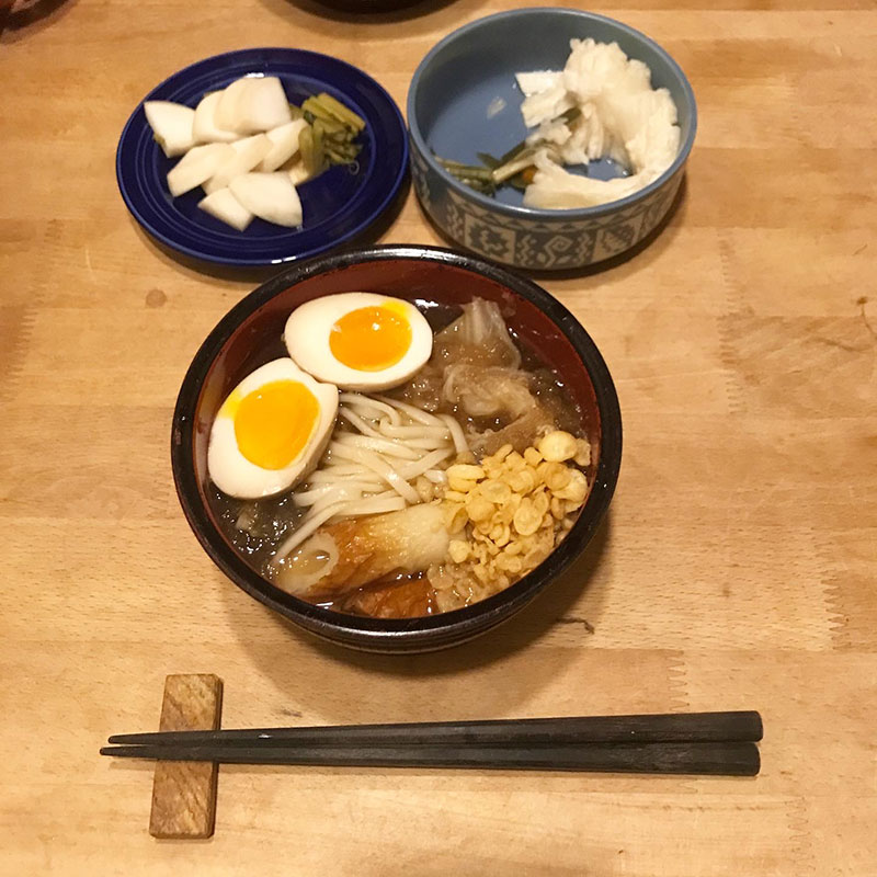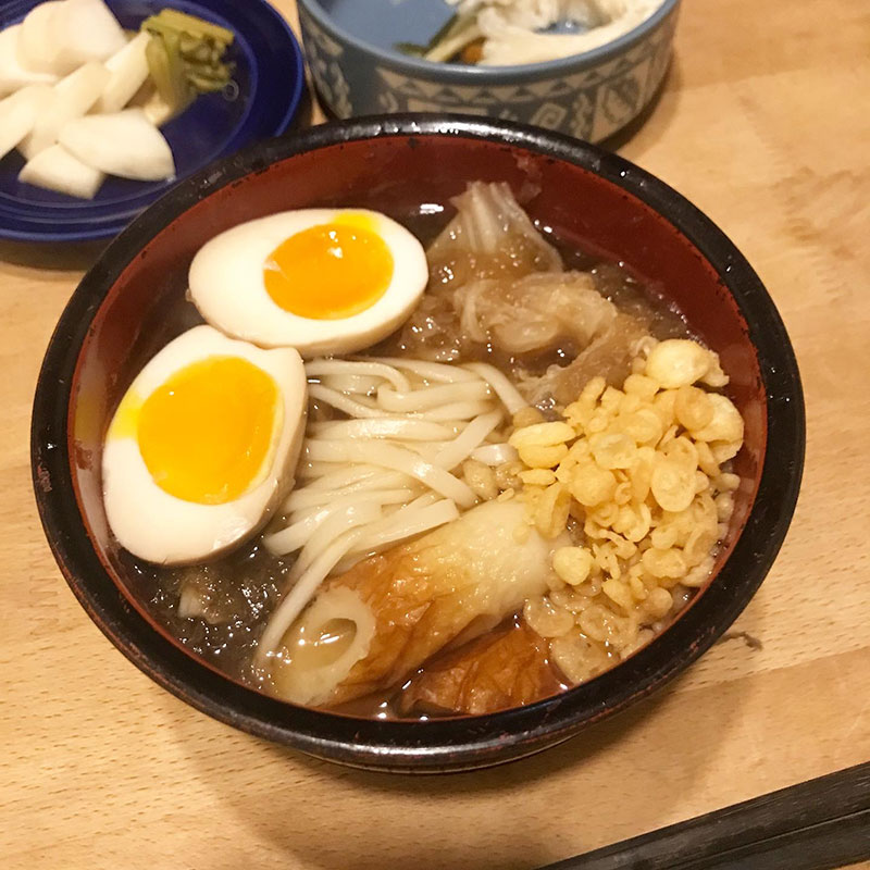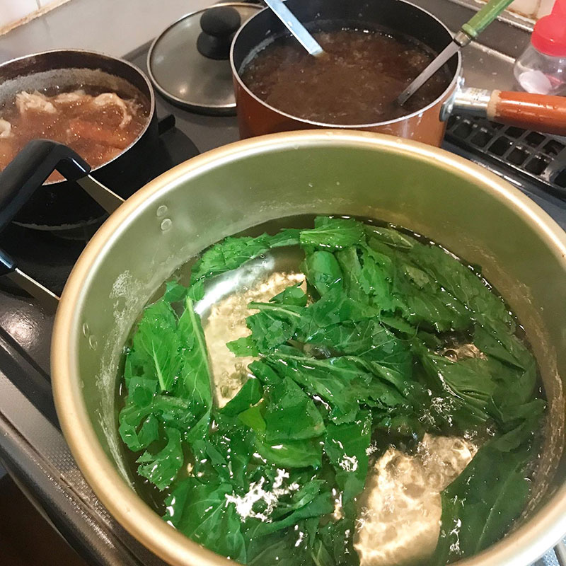 玉松の醤油とざらめとみりんでかえしを作ってツユの出来上がり。具材は味付け半熟のゆで卵、ちくわ、白菜。