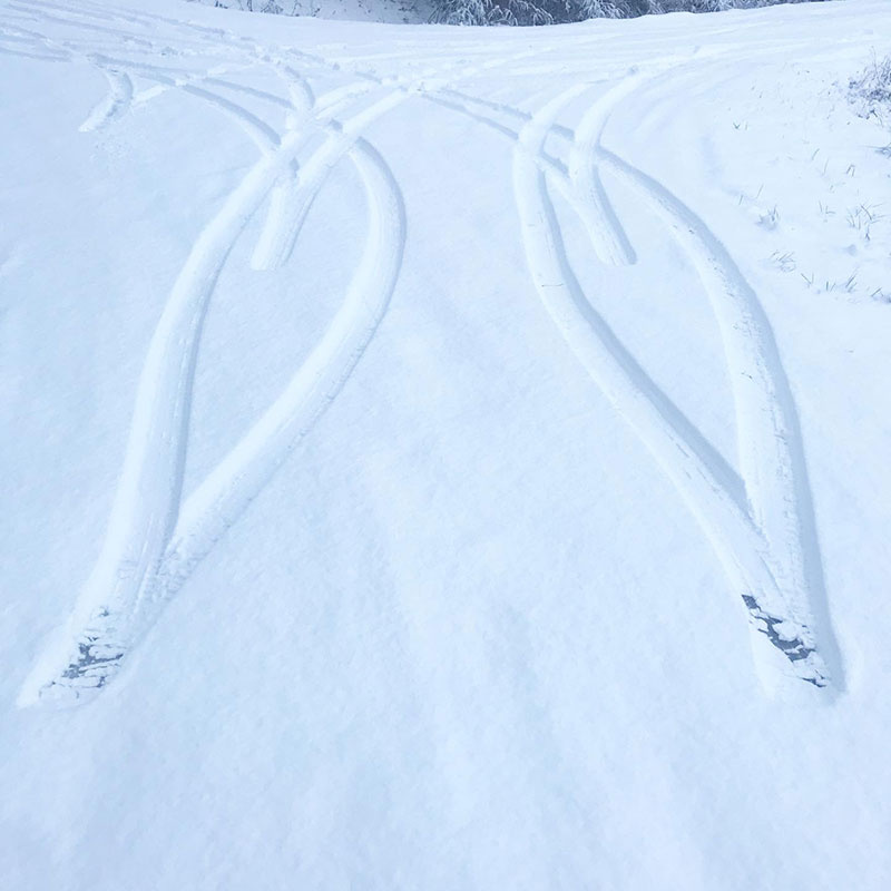 誰かが雪に車の轍で書いたハート。