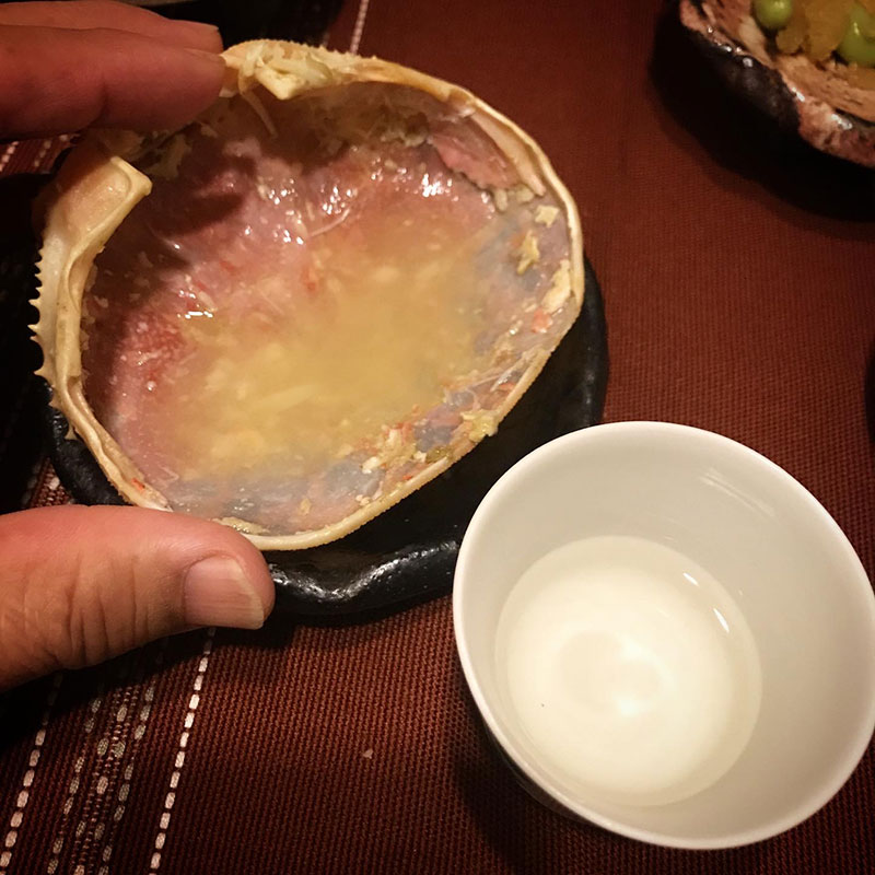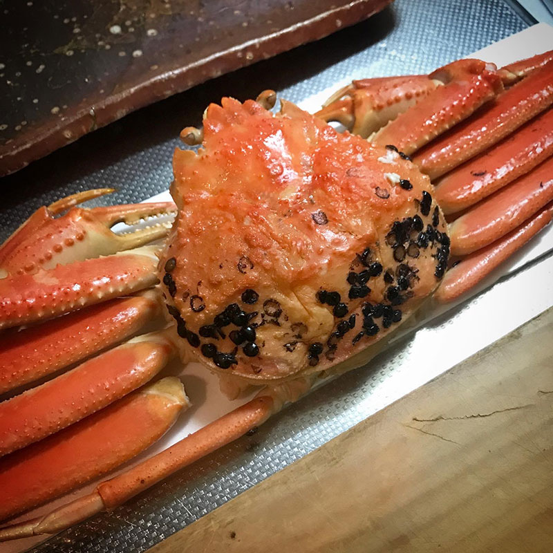 甲羅にこの黒いのがついてるのが脱皮から時間が経ってる証拠で育って身が詰まっていて美味しい印なんだって。確かにすごく美味しかった。