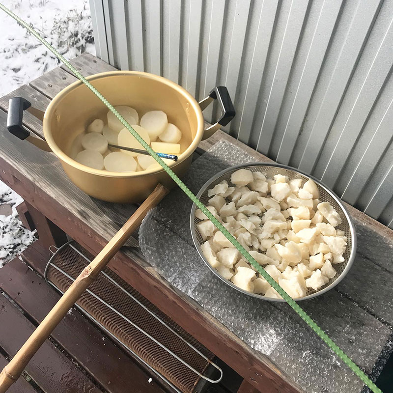 風が通る様に隙間を開けて干した。後は放ったらかし。氷点下と太陽と。大自然に仕込んでもらいます。