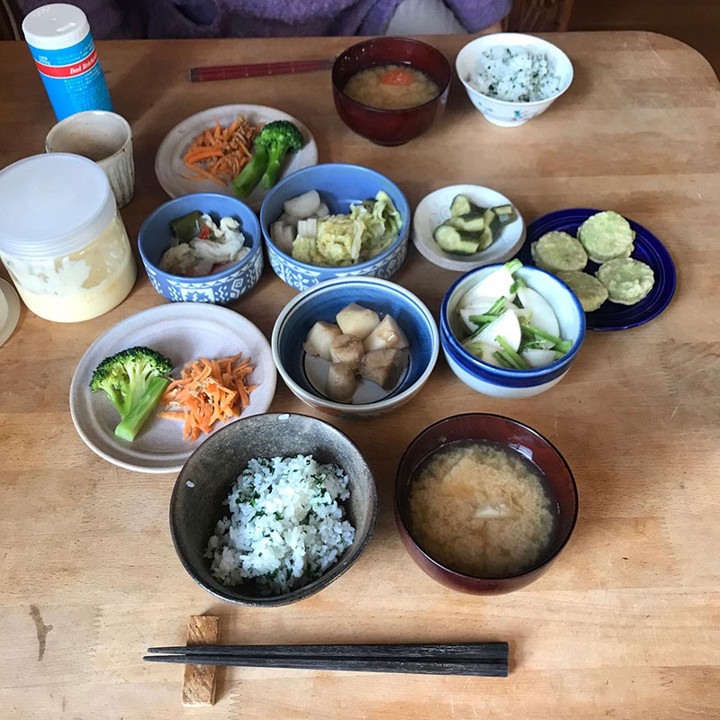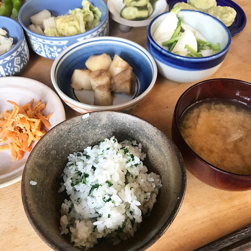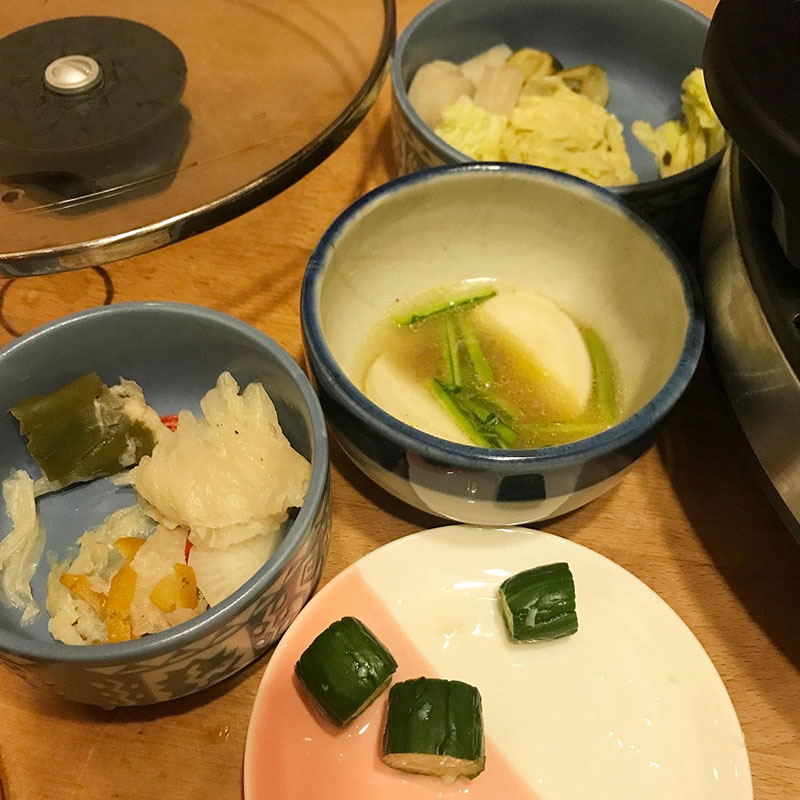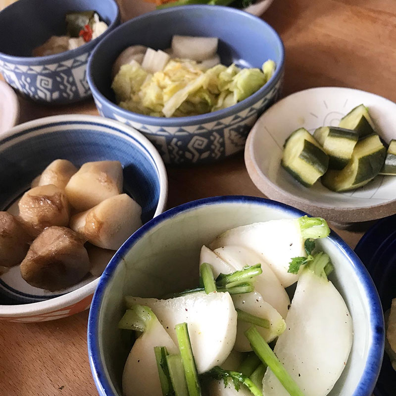 漬け物はカブのオリーブオイル即席漬け、古漬けと浅漬けの白菜漬け、きゅうりの塩麹漬け、大根のぬか漬け、きゅうりのぬか漬け。