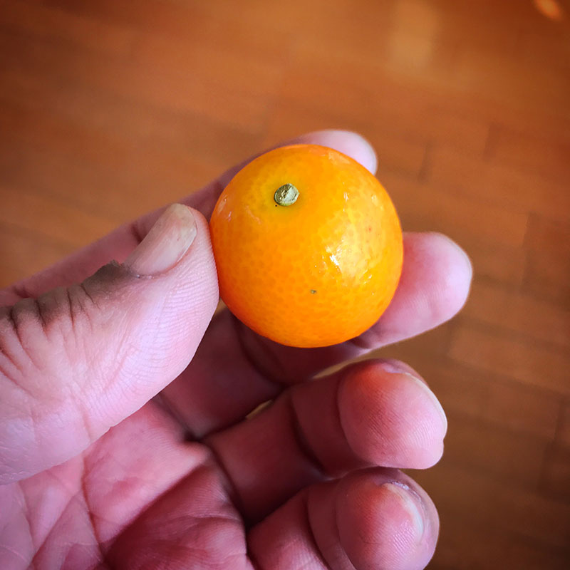 金柑。子どもの頃親父の故郷、三重県のおばあちゃんちで木からもいで食べたなぁ。懐かしい味。