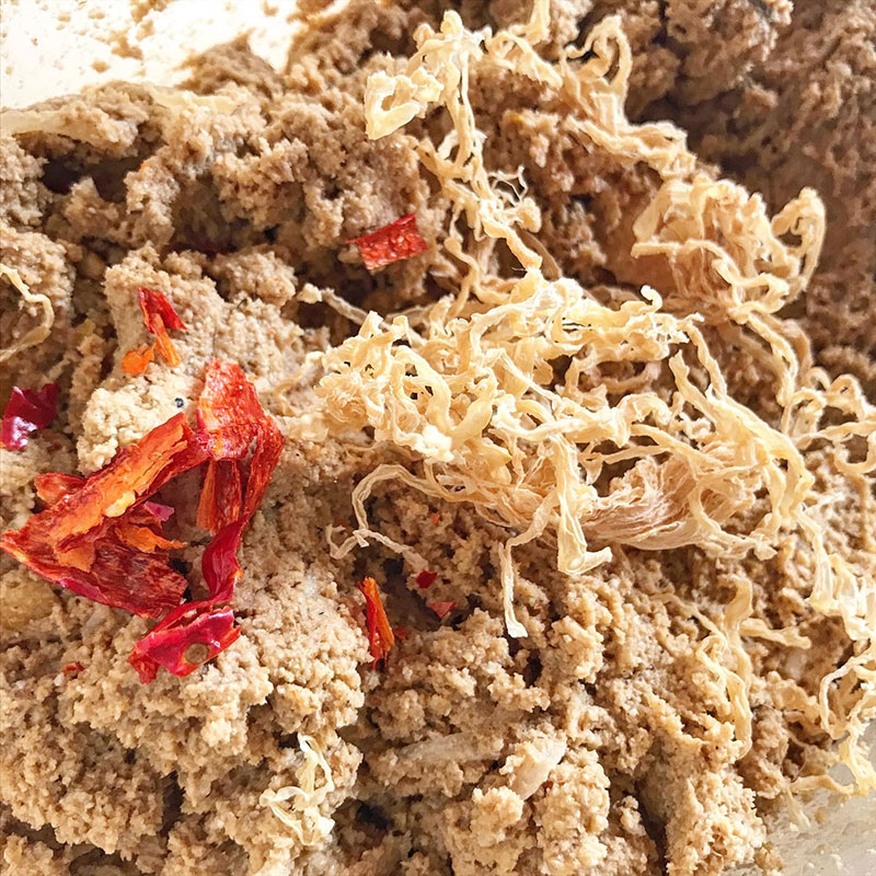 その間に細く作った自家製の切り干し大根と鷹の爪を投入。
