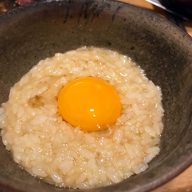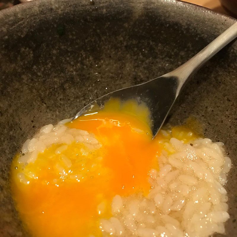 2杯目は卵かけご飯で。白身だけ入れて醤油とスプーンで泡立つまでかき混ぜてから黄身を落とす。