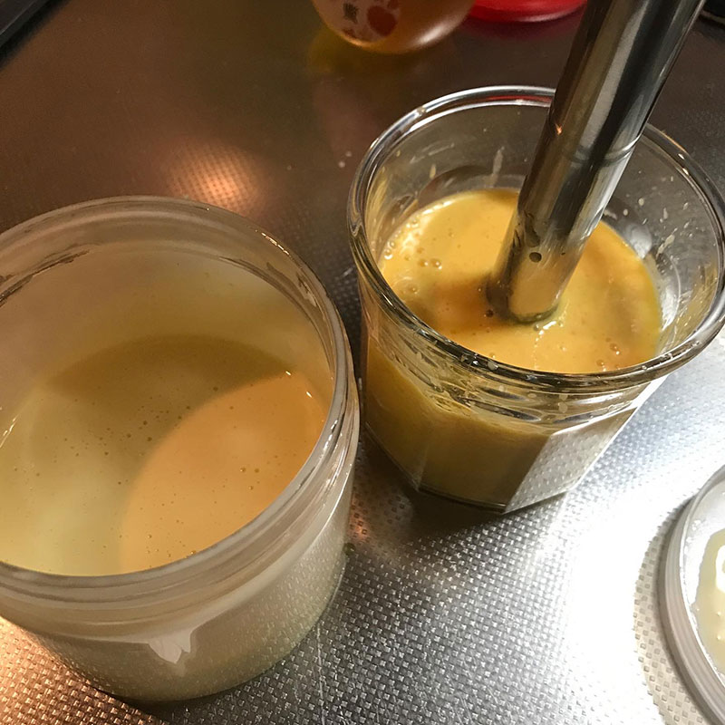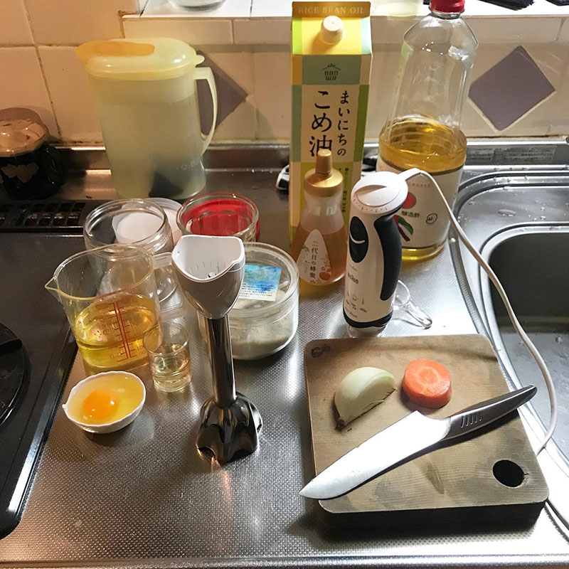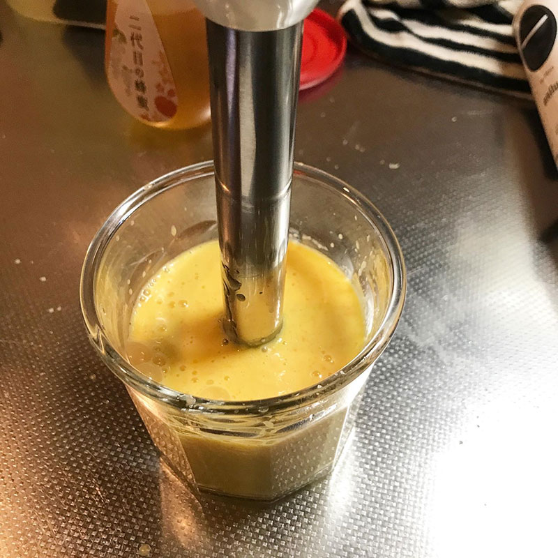 夕食後、ハンドブレンダーでマヨネーズとドレッシング作る。