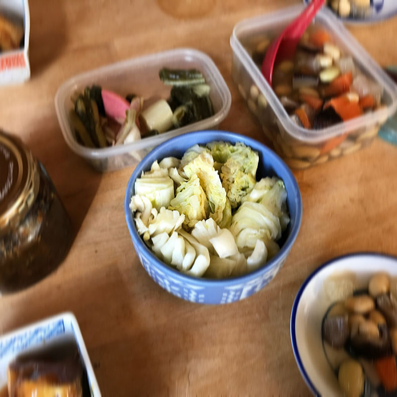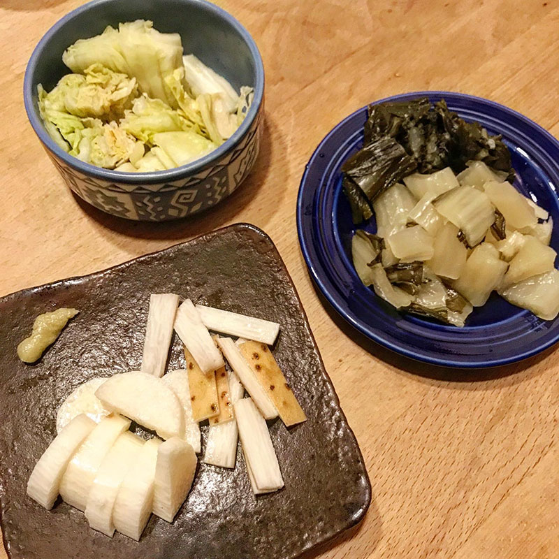 更に同じ方にいただいた秩父名産しゃくしな漬け。これがまたご飯だけじゃなくて純米酒にも合うこと。自家製の白菜漬けと長芋のぬか漬け。
