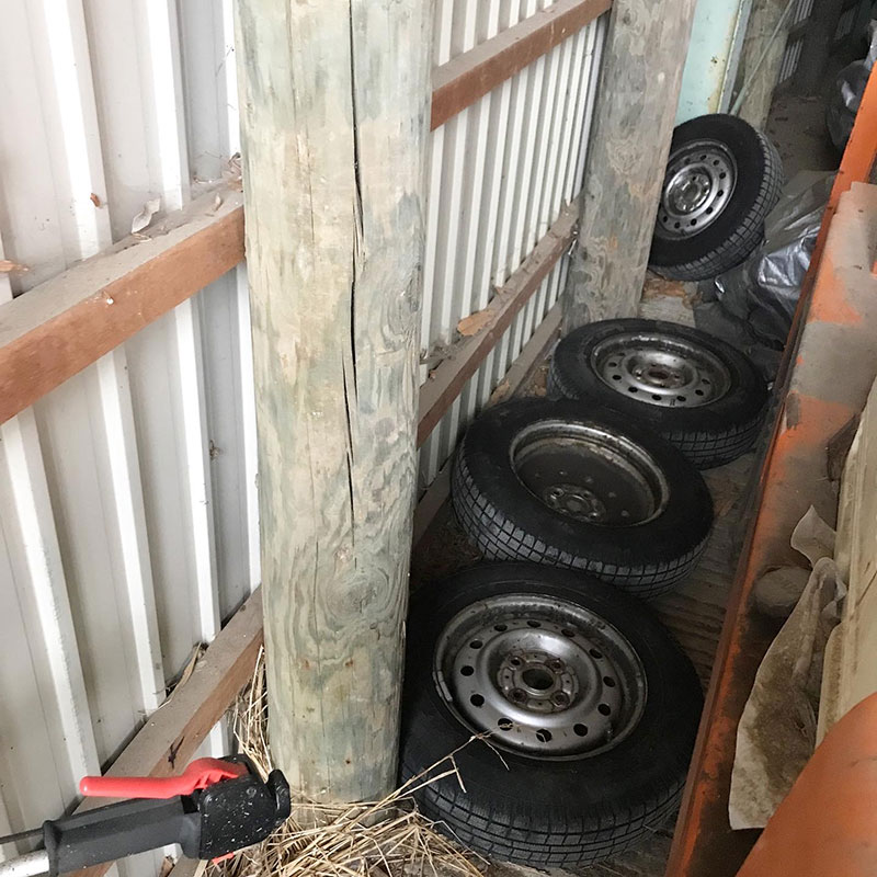 そうそう先日、交換して壁に立てかけてあったスタッドレス・タイヤも全て倒れていた。石の彫刻も倒れたし。