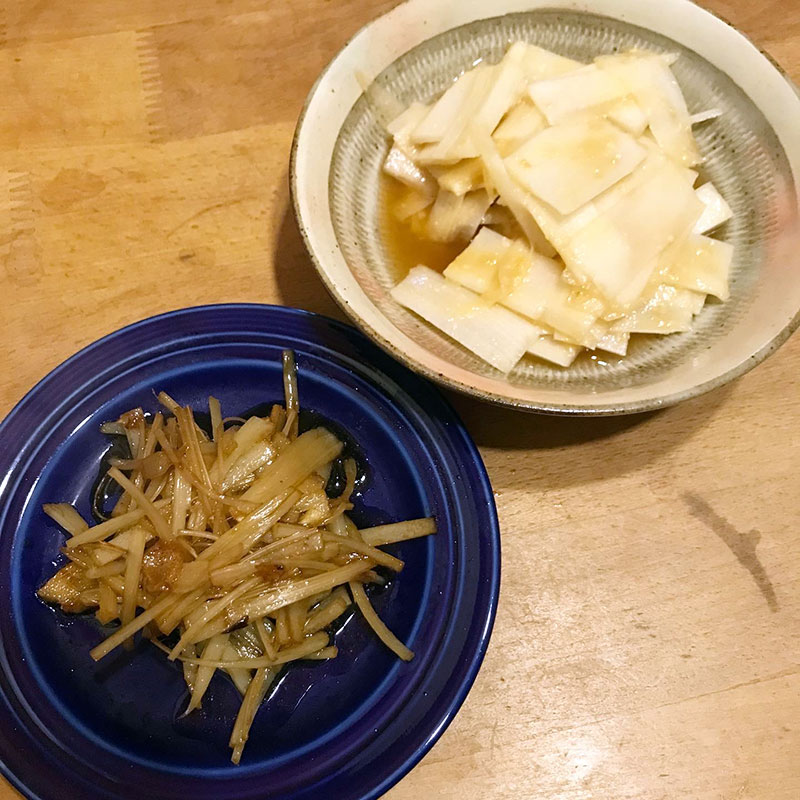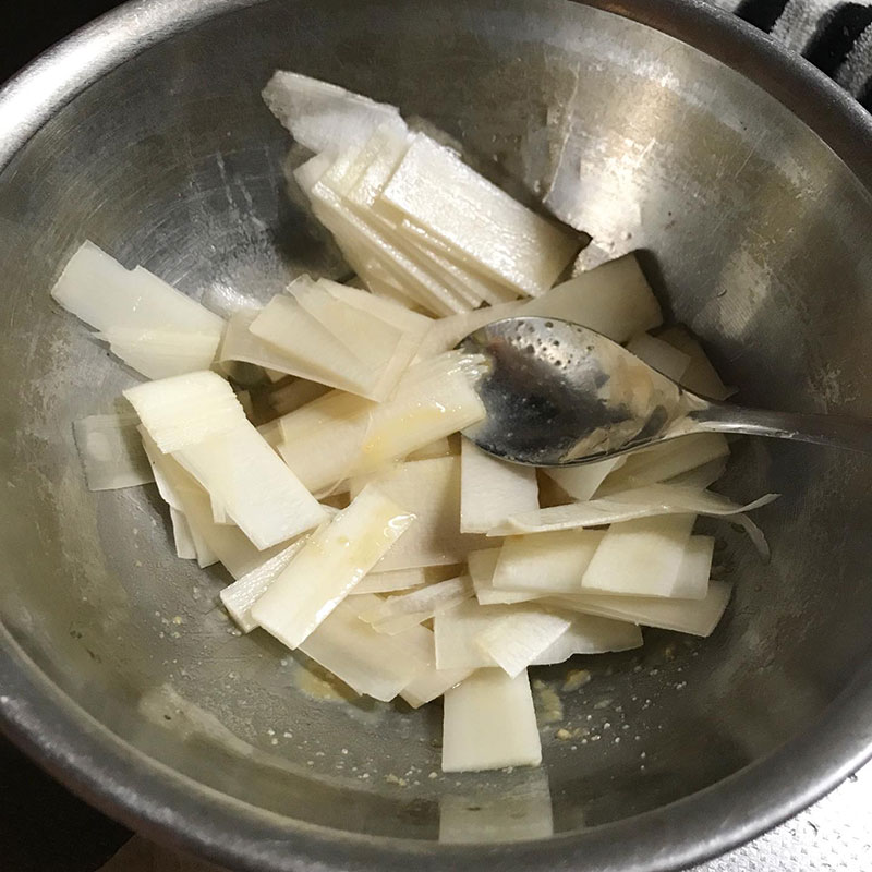 厚めに皮を剥いて炒めてきんぴらに。芯は薄い短冊に切って酢味噌和えに。切ってるそばから水が滲み出てくる。