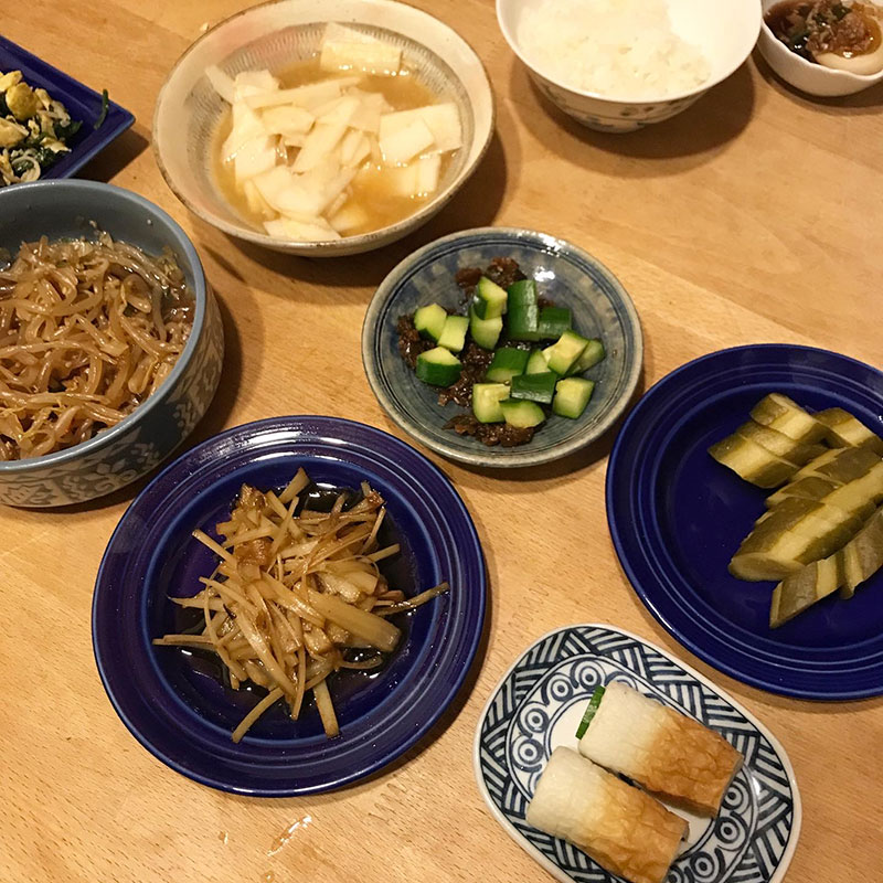 そのタレを混ぜた茹でただけのもやし。きゅうりのぬか漬け。