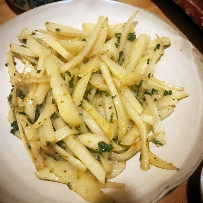 細切りにしたじゃがいもをニンニクの香りを移したオリーブオイルで炒めて白ワインビネガー振り入れたら蓋して蒸し焼き。火が通ったら蓋をとって水気を飛ばしながら隠し味に自家製の柚子胡椒。菜飯用に茹でたカブの葉を塩と合わせてるもので味付けして完成。