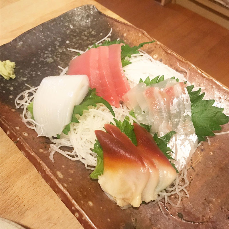 刺し盛り。刺身はいただいた純米酒で。そして赤い金麦。