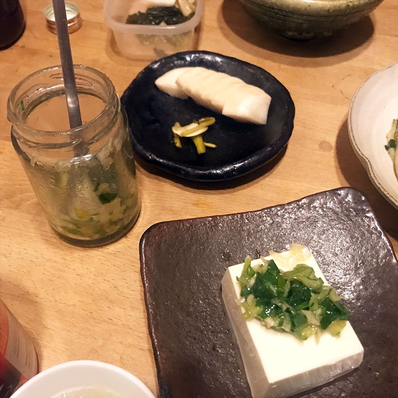 自家製のねぎ塩ダレで冷奴。味付け半熟卵。