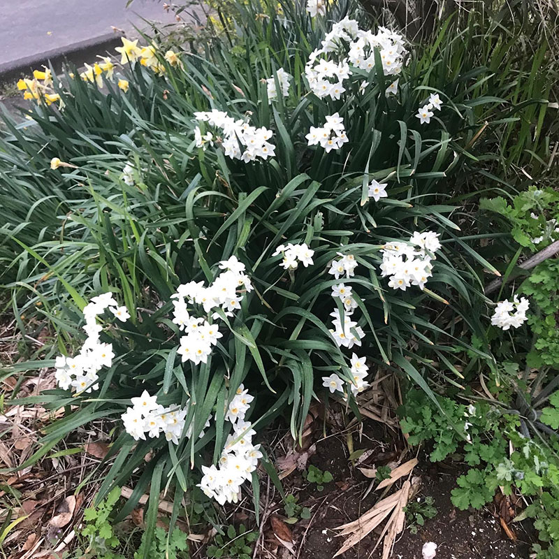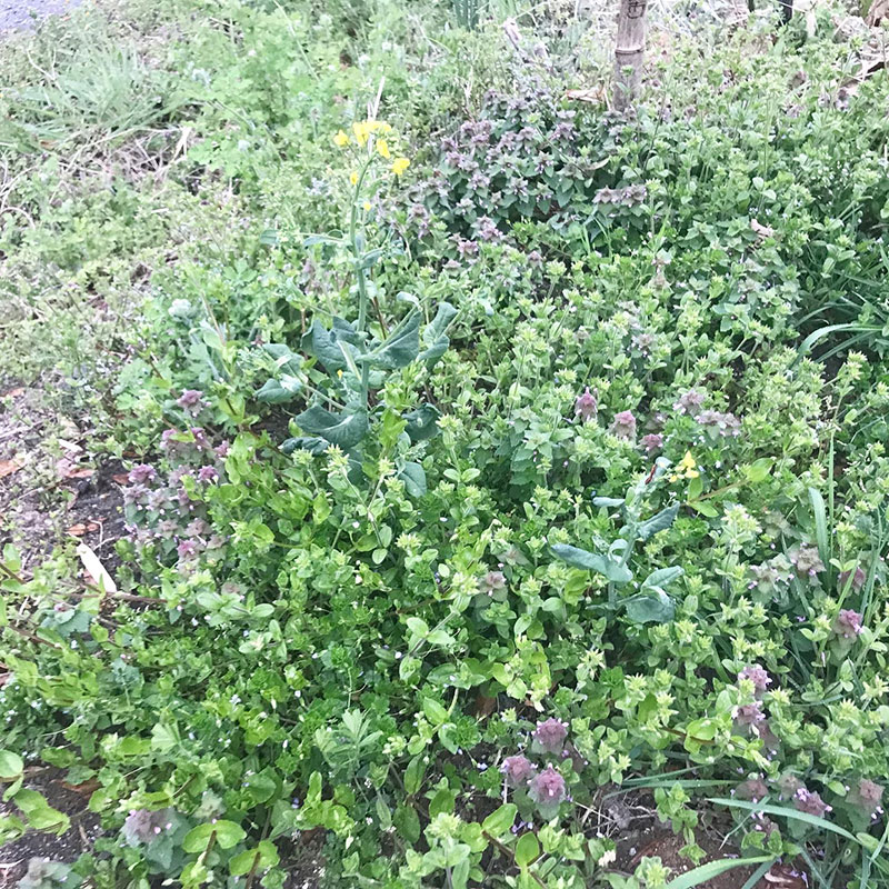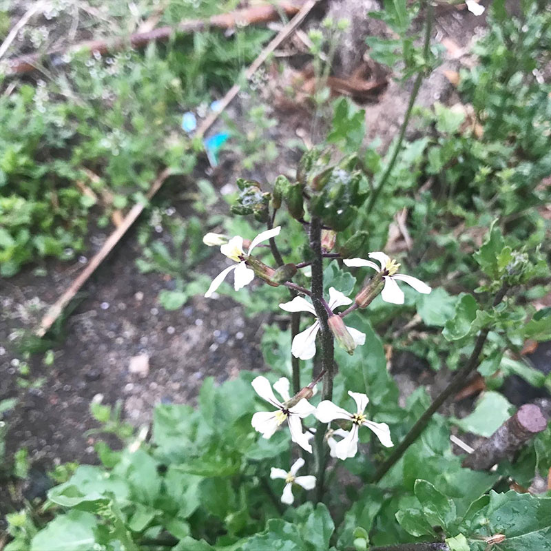 そろそろ畑のシーズン。今日の、庭の猫の額畑の様子。ルッコラの花。