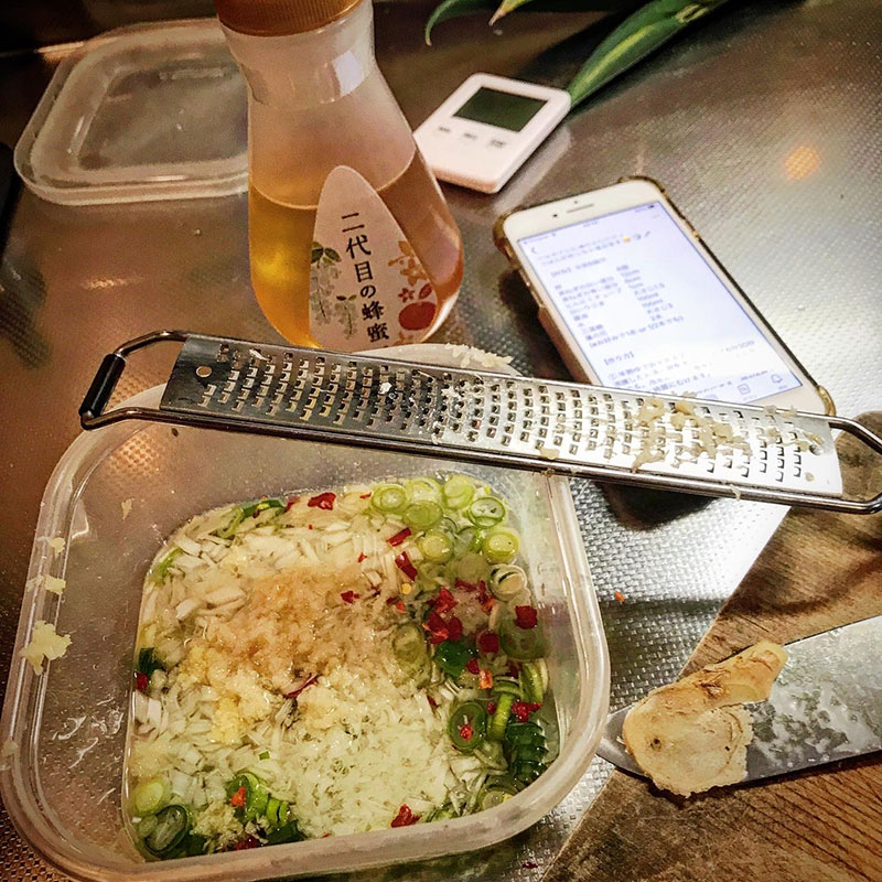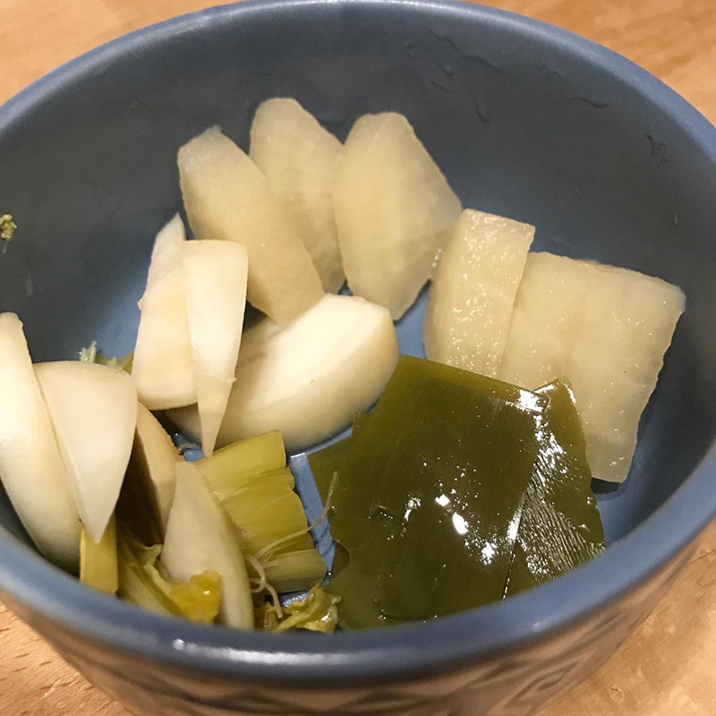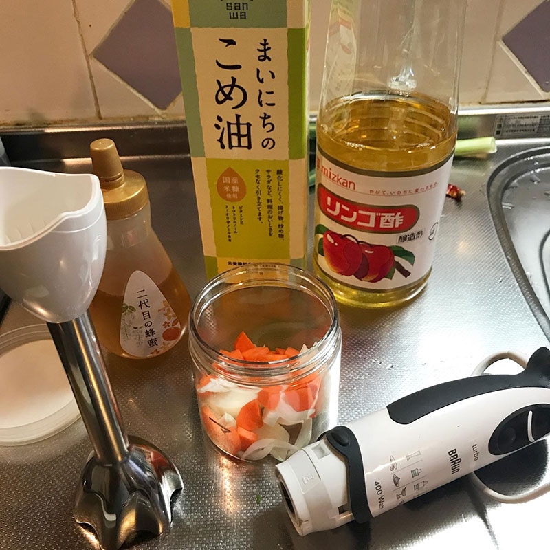 ぬか漬け昆布 今日のぬか漬け。大根、カブ、昆布。ほとんど毎週、蕎麦を作ってるので昆布で出汁をとる。 ぬか漬けにすると美味しいとインスタで見て真似してみた。美味しい! 台所に常備してる出汁醤油とかえし。醤油には昆布と鰹節、料理の際に出た椎茸の石づきを放り込んでる。 かえしは醤油とざらめと味醂を煮たもの。 今宵の仕込み。 味付け卵。長ネギ、玉ねぎ、生姜とニンニクのすりおろし、自家製鷹の爪、白胡麻、 黒七味、 蜂蜜、 醤油、水。 ハンドブレンダーで 玉ねぎとにんじんのドレッシング。 どちらも蜂蜜が活躍。 2022年4月5日 | コメントはまだありません | カテゴリー: 三日坊主日記