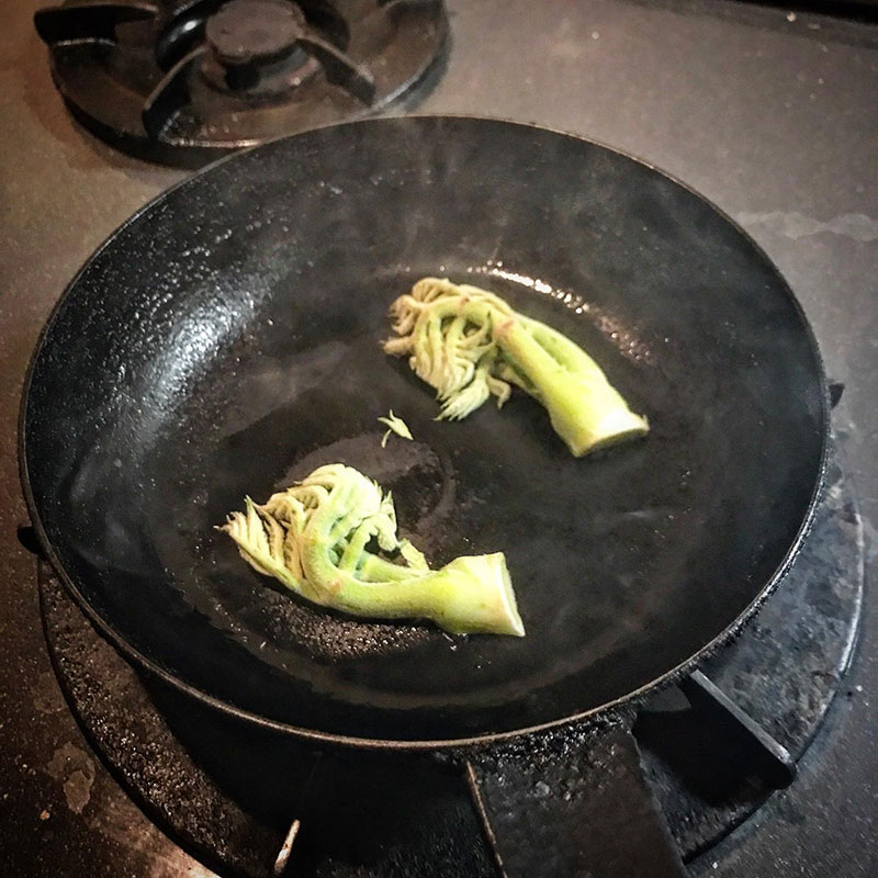 タラの芽は生産者のおすすめの通り、半分に切って断面をソテーして出汁醤油ひと振りしてから天ぷらに。