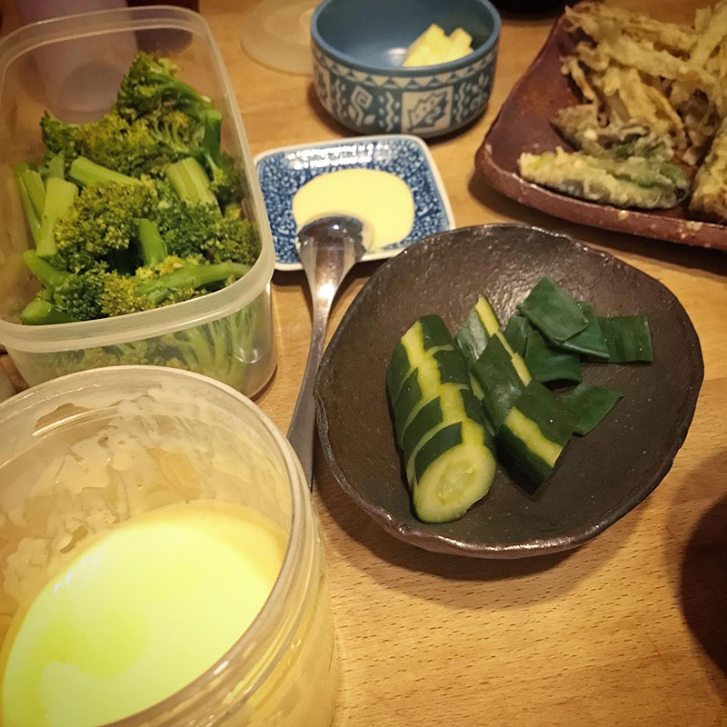 きゅうりと長ネギのぬか漬け。毎日食べてるブロッコリーは自家製マヨネーズで。