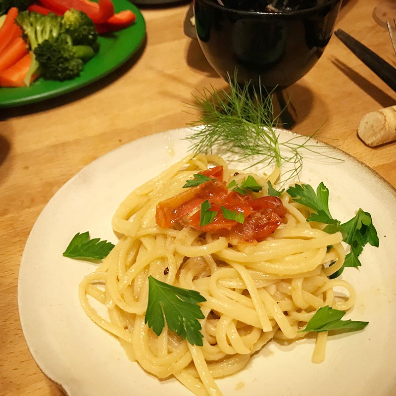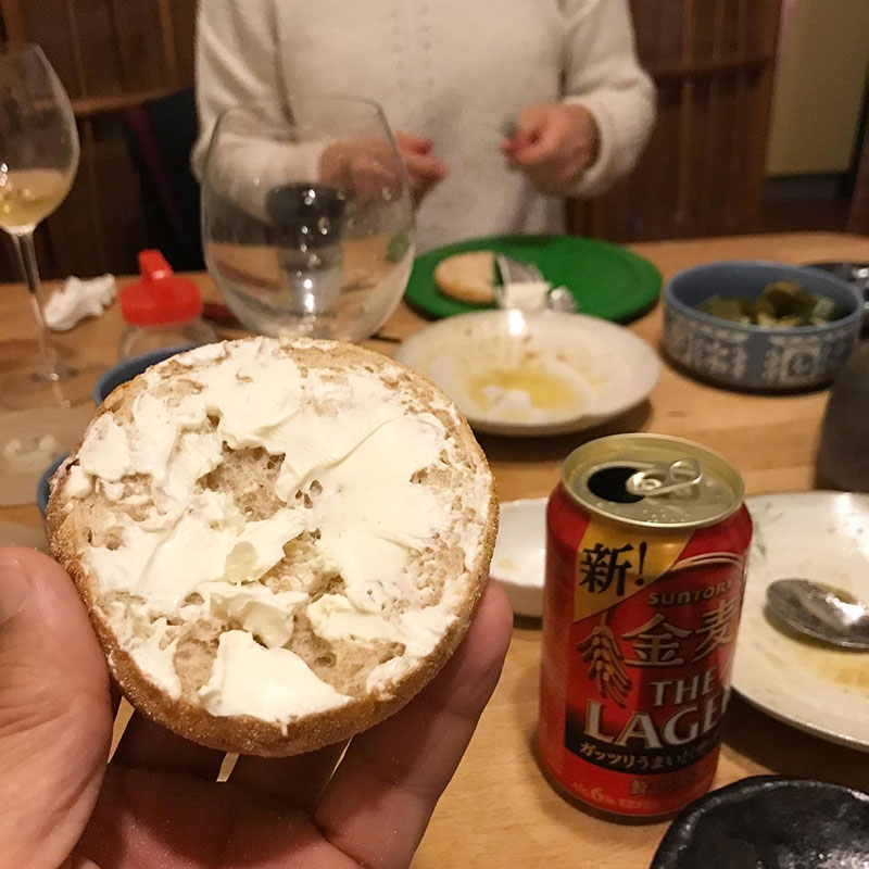 リングイネのパスタ、ひとり40gでお腹いっぱいにならなかったので全粒粉入りのイングリッシュマフィンにキリーのクリームチーズ塗って。