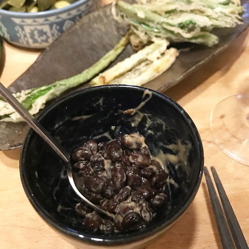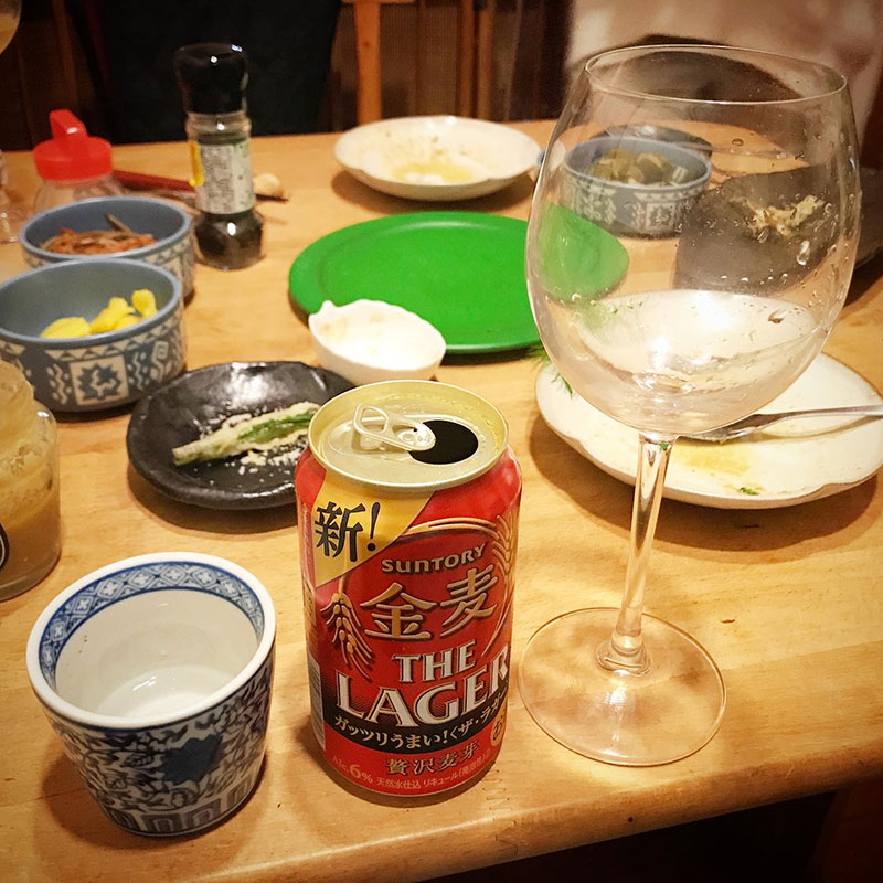 バーニャカウダはスパークリングワイン、行者ニンニクの天ぷらは山形の日本酒 高清水、そしていつもの赤い金麦。