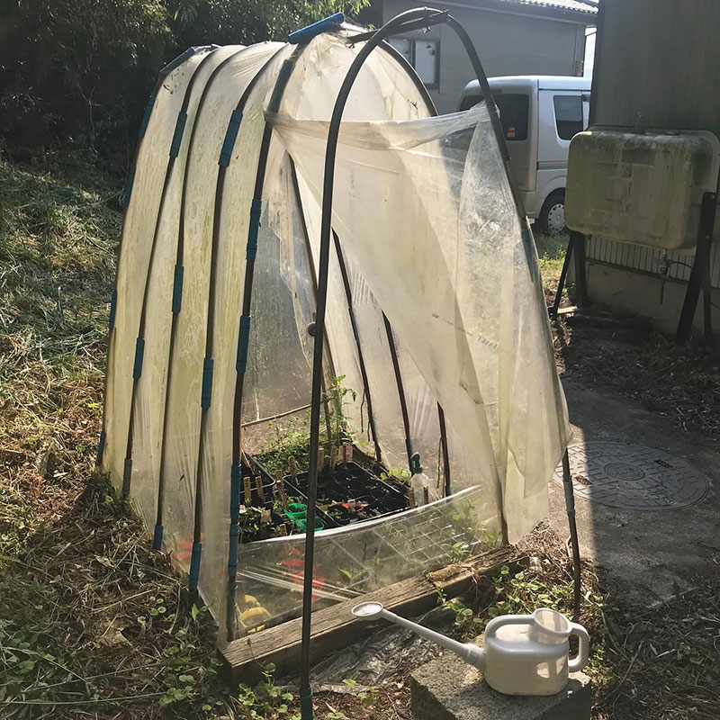 朝の時点ですでに40℃近いのでミニハウスのビニール全開に。