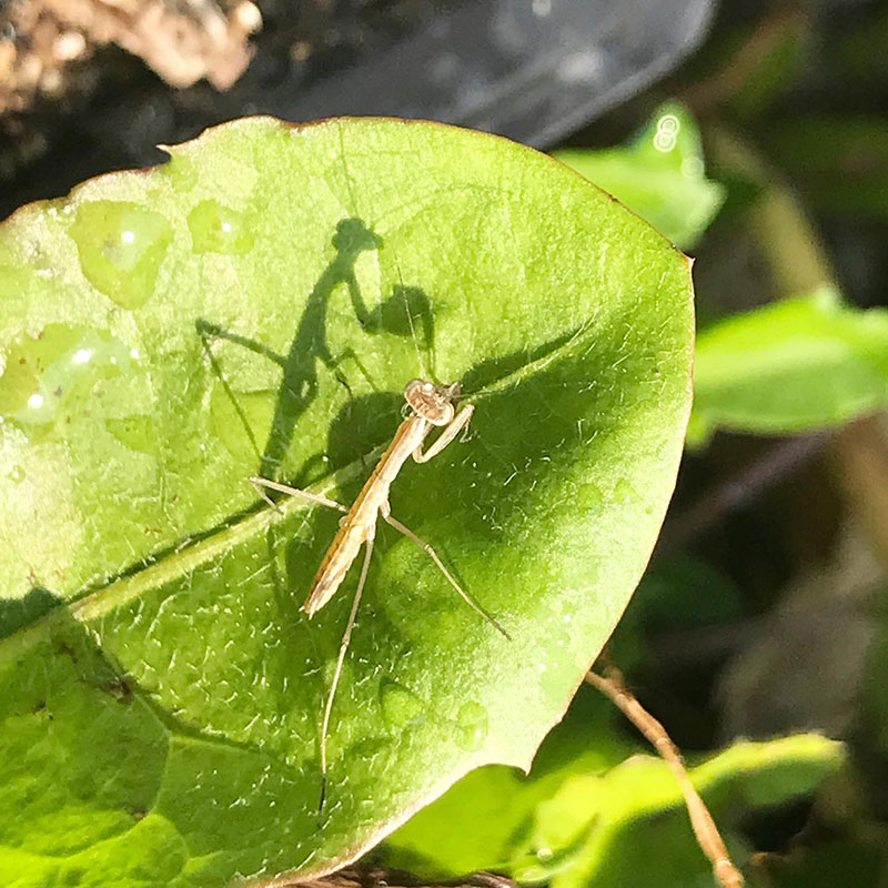 玄関先でカマキリの卵が孵ったみたい。体長1cmにも満たない小さな小さなカマキリがあちらにもこちらにも。