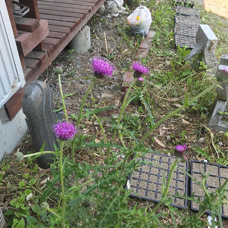 数年前に山から取ってきて植えたアザミが咲いた。