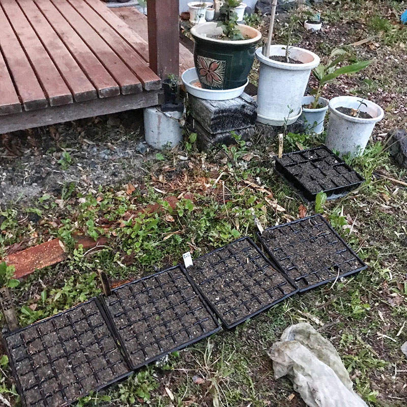 連結ポットにまいた種が強い雨で流れてしまうと困るので