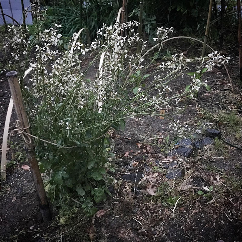 満開のルッコラ。雨で倒れた。自家採種するので竹の棒立てて支えにして巻きつけておく。