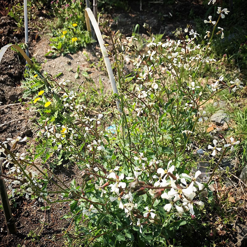 ルッコラの白い花が満開。