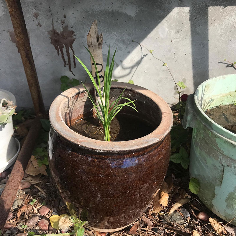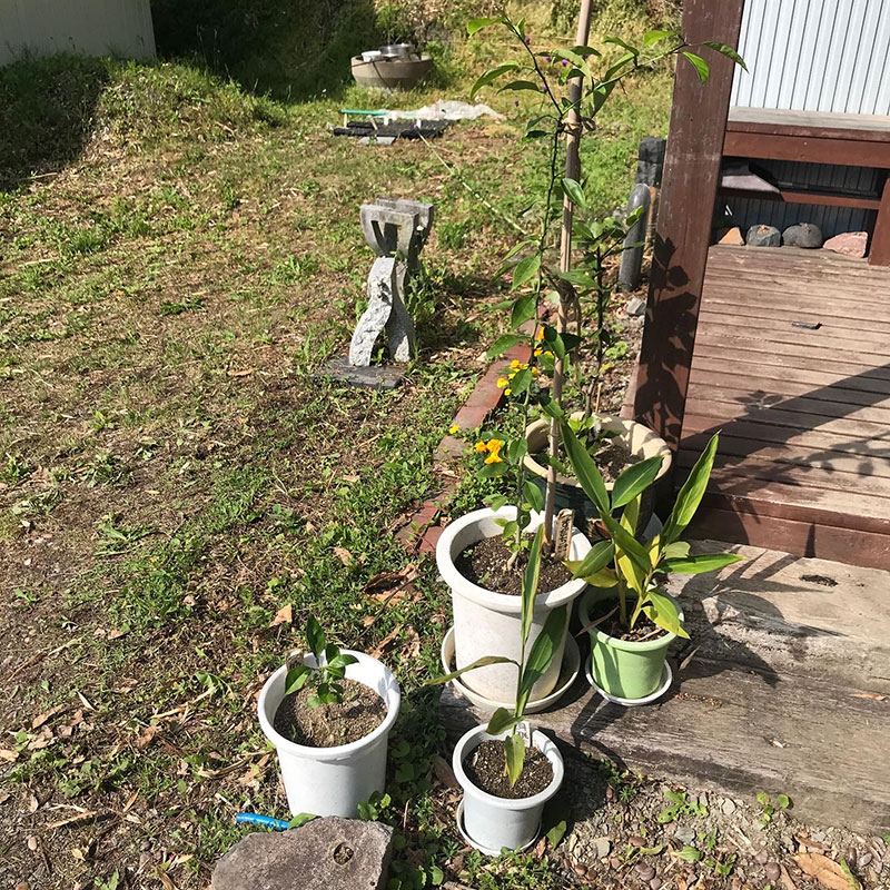 玄関先の鉢たち。月桂樹、阿波徳島のすだち、名護の月桃、柚子。