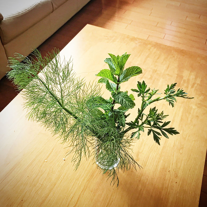 今日は30℃まで上がるんだって!そんな夏日の夜はバカルディラム開けてモヒート飲もうか。庭のミント、フェンネル、イタリアンパセリ摘んで洗ってグラスに挿しておこう。