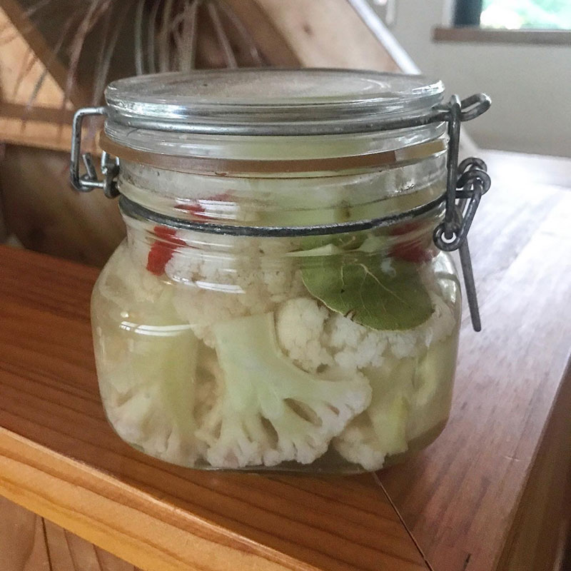 採りたてのカリフラワーをいただいたので酢と水とハチミツと畑で育てた赤唐辛子と鉢の月桂樹とゲランドの塩でピクルス仕込んだ。