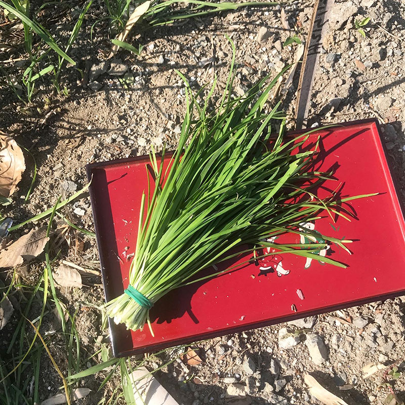 今宵の一品のために畑からニラを収穫.フェンネルの周りにたくさん生えてる。