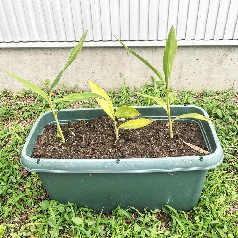 沖縄の名護から送ってもらった月桃。同じく出来るだけ水やりを我慢。だけど鉢からプランターに移し替えたら写真でもわかるほど葉が黄いろに。お願い、枯れないで。これも沖縄みたいに暑い日が続いたら復活してくれるかなぁ。